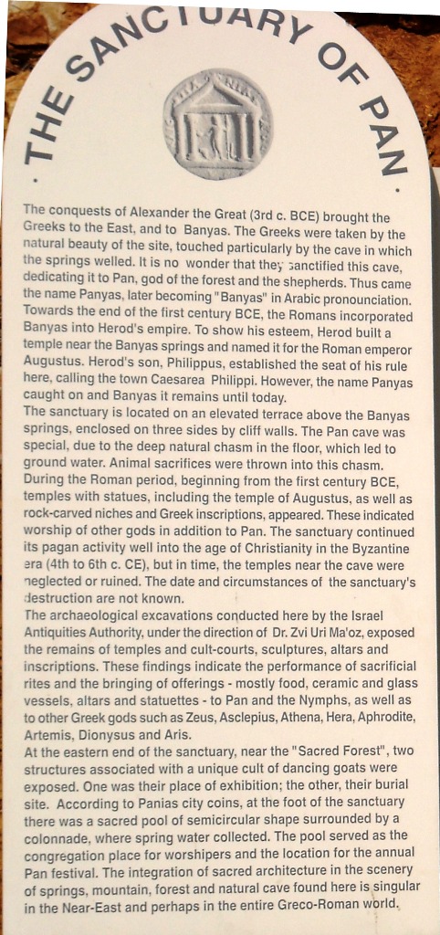 After leaving Dan we proceed to Banias. Banias is the Arabic form of Panias (Arabic doesn't have a letter corresponding to "P"). A town was originally built by the Greeks in honor of their god, Pan. But at Jesus time it was known as Caesarea Philippi because Herod's son Philippus made it the seat of his rule. The spring is one of the three head waters of the Jordan River. The river coming from the springs is known as Hermon River. |