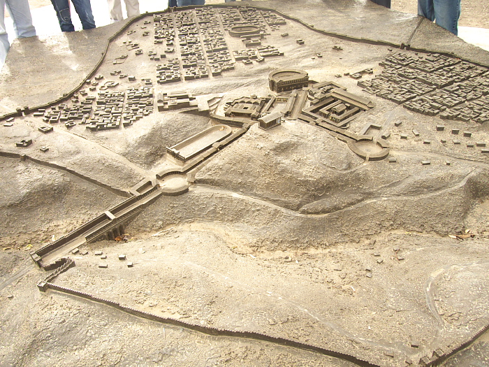 This is the view of the town from the hill. The theater is at the far end of the Palladius Street and the bathhouse is in front of it on the right. |