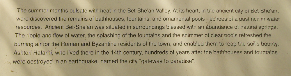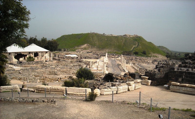 Excavations at Beit Shean show 15 different civilizations there. The main town is largely Greek and Roman or later. The hill just outside of the Roman town shows older civilizations including some Philistine ruins and an Israeli fortress from the time of Solomon. This city is at a strategic point in the Jezreel Valley and close to a major highway. The city is mentioned in 3900 year old Egyptian documents and appears to be fortified 3500 years ago. The Israelites were unable to conquer the Canaanites in this town until the time of King David. King Solomon made it an administrative center for a region. Under Romans, it became part of a ten city alliance, Decapollis, that stretched east accross the Jordan River. The town was destroyed by a strong earthquake in 749A.D which toppled the columns supporting buildings and roofs along the streets. After being excavated, some columns have been reset. Some reference links: Jewish Magazine and Jewish Virtual Library. |