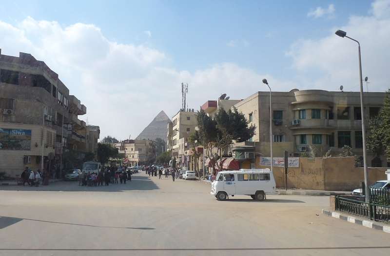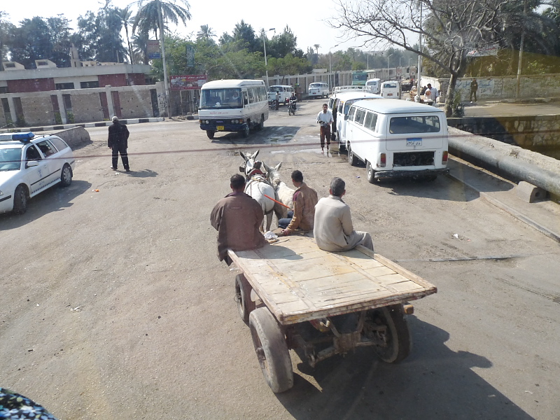 Cairo is an extremely large city (over 20 million) but rather poor. There are some wide streets with 3 or more marked lanes in each direction often separated by a meridian. It was common to see men sweeping the edges of them with brooms. Outside of the central district, cars shared the road with donkey carts. Lane markers are just decorations. There are very few stop lights in the city. Consequently traffic does not stop and somehow just mixes at intersections. Horns are sounded frequently. Streets are jammed during rush hours. Pedestrians have to dart between cars to cross a street. At least on the we traveled on, after dark leaving ones headlights off is considered the sign of a professional driver. But we saw no accidents while on our bus trips.
