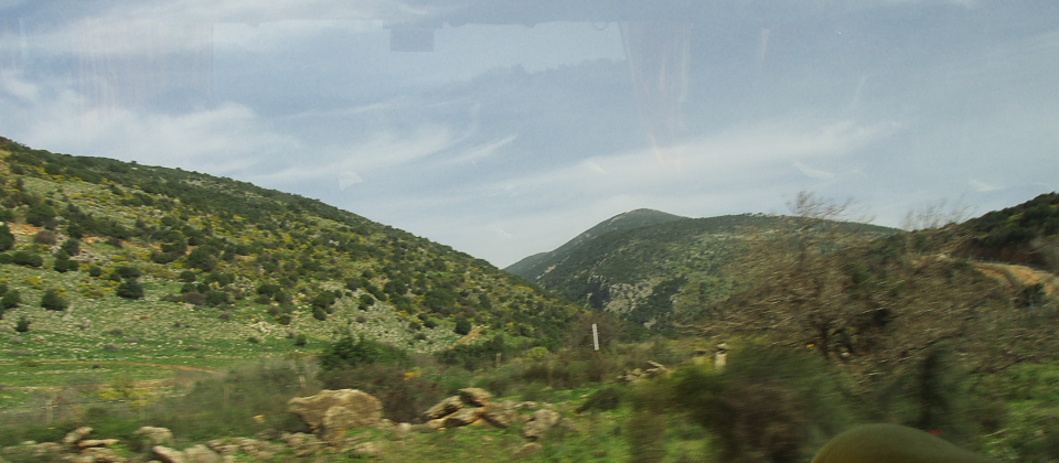 Above: On the way to Dan, we passed by this Israeli farm. That is an orchard just on the other side of the road. Right: We are quite close to the Lebanese border. The trees on the North side of the road were planted to hide vehicles from Hezbollah and their guns in Lebanon. |