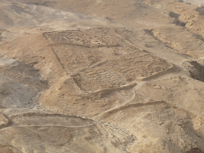 At the top we can look at a model of Masada. The main part is the area on top of the hill. It is surrounded by a wall. In the hill below Masada we see a path and aqueduct. One can see why Masada was a great defensive fortress. |